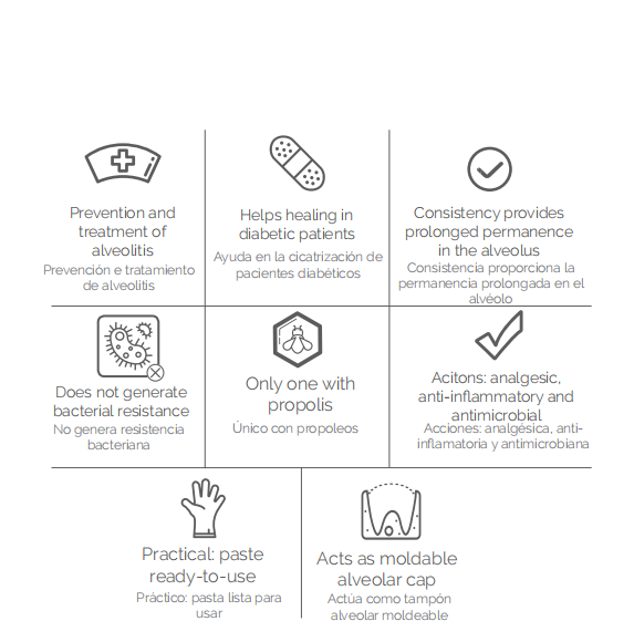 Alveolex is gradually eliminated from the alveolar cavity over up to 30 days as the socket is filled with granulation tissue and newly formed bone. The propolis in the formulation not only promotes regeneration and stimulates healing but also helps provide analgesia, ensuring a more comfortable postoperative experience for the patient.