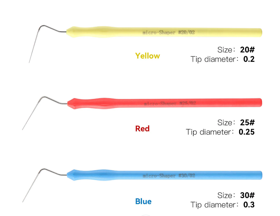 A set of micro-instruments designed for precise endodontic work under the microscope. Made from matte, slim, high-tenacity material for accurate probing, shaping, and debris removal inside narrow or complex canals. Steam-sterilized and recommended for single use.