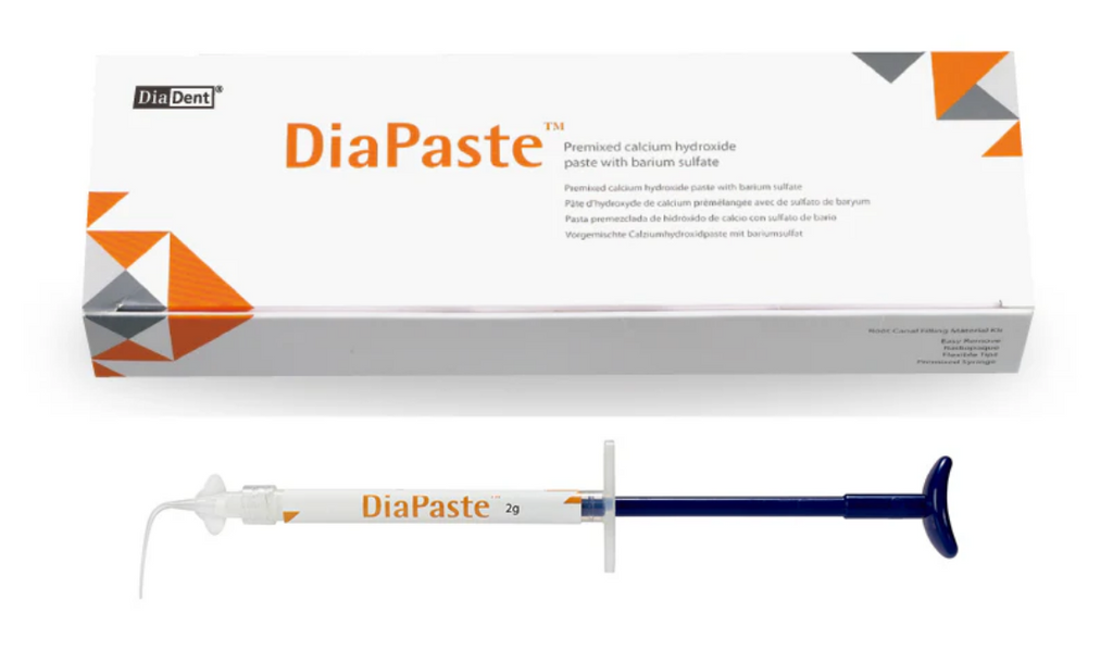 DiaPaste is a great alternative to our most popular product, Diapex. DiaPaste is a premixed calcium hydroxide barium sulfate paste for root canal treatment. It is iodoform-free. DiaPaste is water-soluble, so it is easy to clean and remove. It is also radiopaque and antibacterial. The premixed paste is packaged in a convenient syringe, eliminating the need for mixing and providing an ideal vehicle for application to the root apex. Diapaste may be used in conjunction with Gutta-Percha and regular canal sealers.